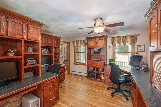 The main home has 4 bedrooms and 4 bathrooms, including a primary bedroom with en suite bathroom, whirlpool tub, and walk-in closet. Enjoy your morning cup of coffee on the covered front porch while watching the birds in the front yard. As you walk into the entryway, to your left is an office with four separate built-in work stations that are perfect for working from home or setting up homework/study stations.