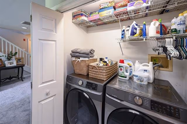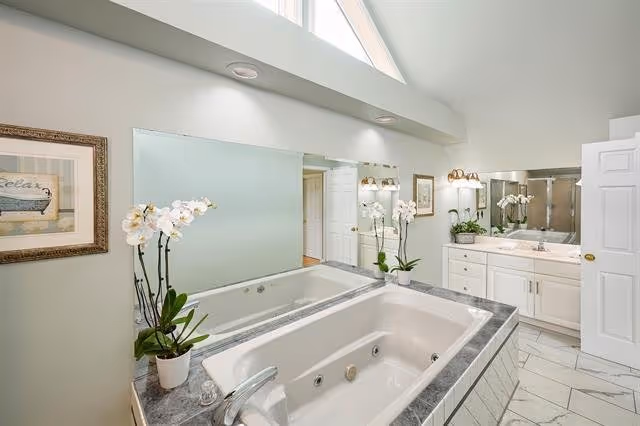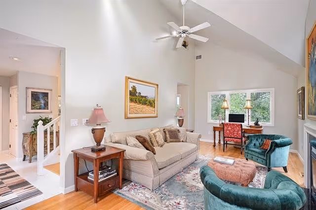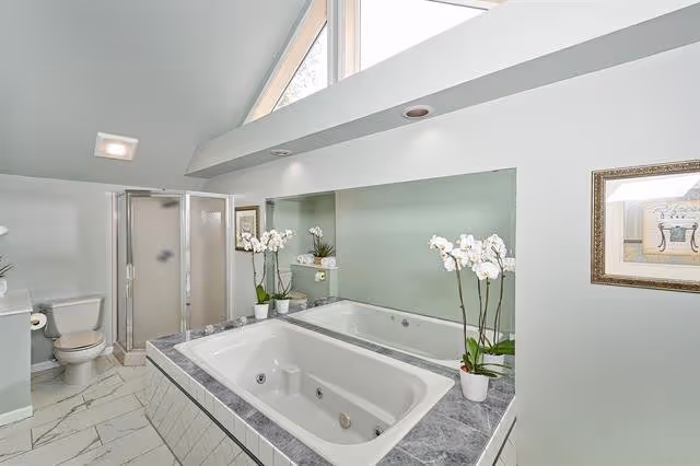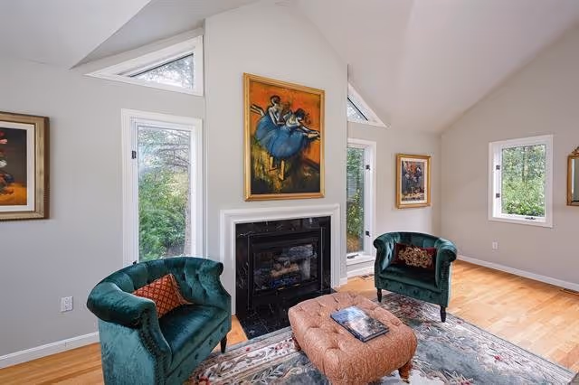 On the main level there's an eat-in kitchen, spacious dining area, foyer, half bath, and living room with a fireplace. The upper level is dedicated to the primary suite and has it's own private porch, walk-in closet, and large en suite bathroom with a step-in shower and soaking tub.