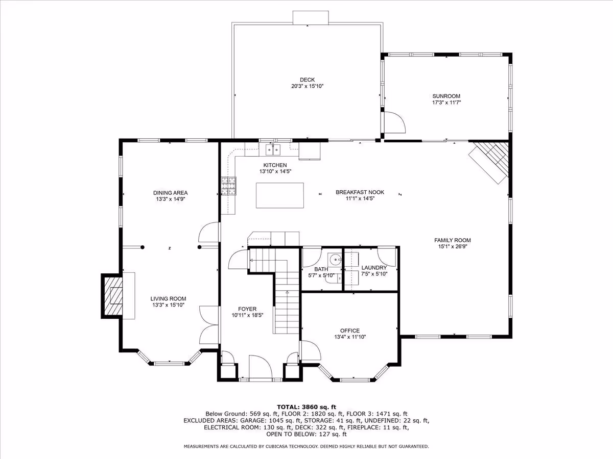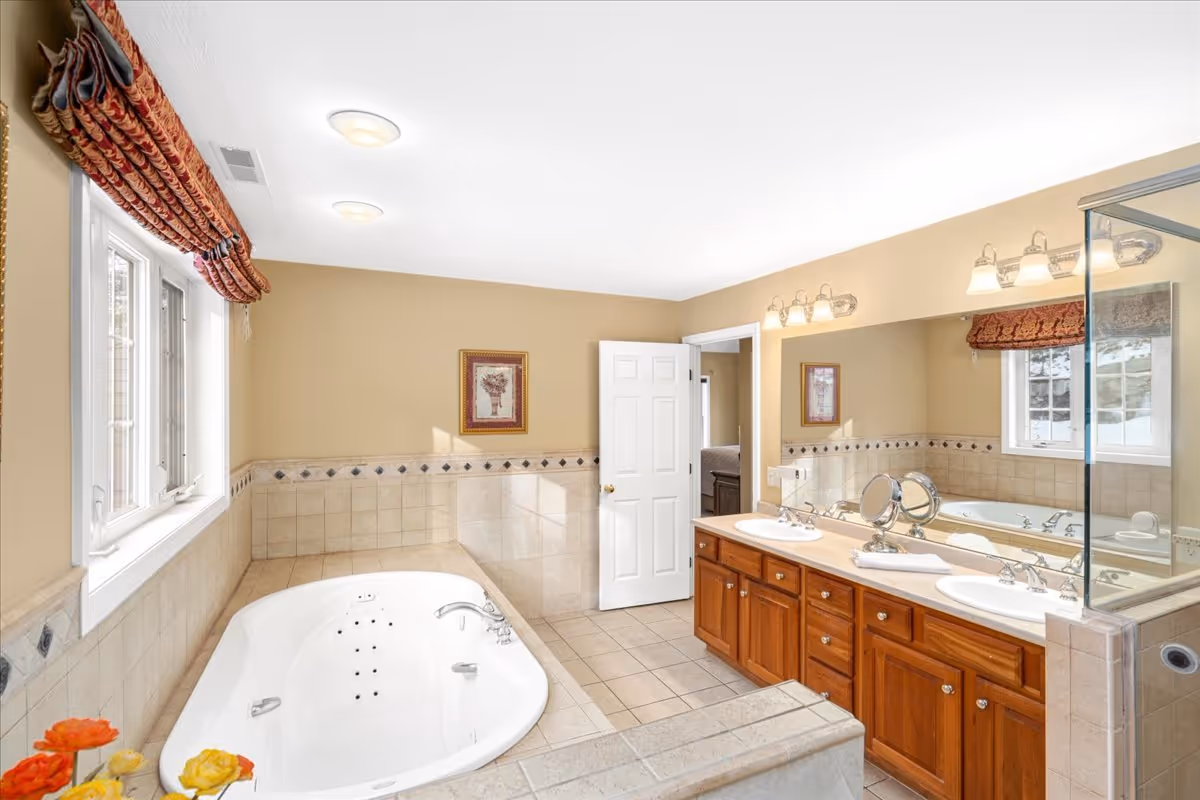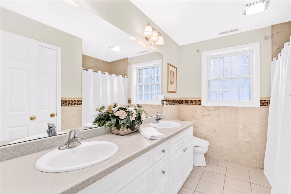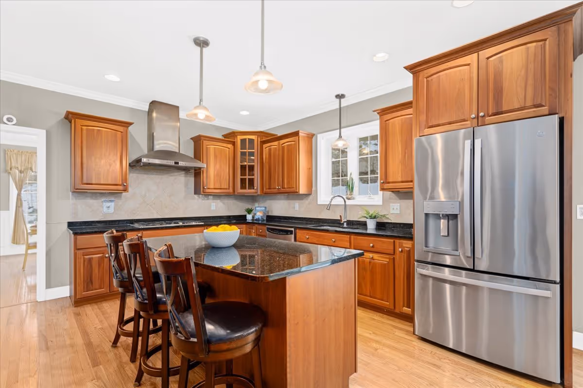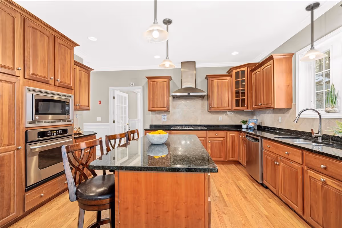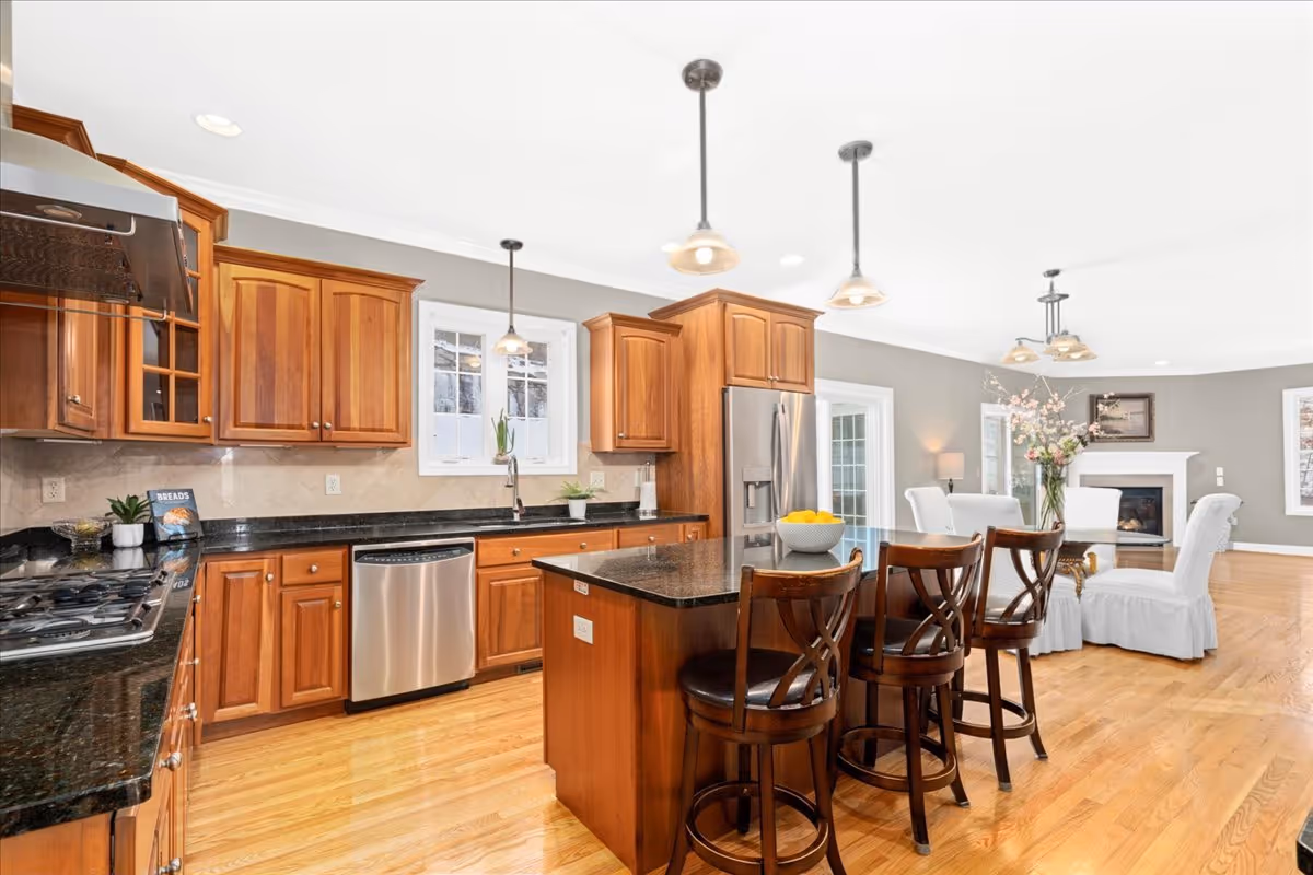 Seamless French doors connect the chef's kitchen—complete with cherry cabinets, stainless steel appliances, and gleaming granite countertops—to the elegant dining area, marrying functionality with style. Unwind in the sun-drenched family room, where a cozy gas fireplace beckons relaxation. Adjacent, the bright sunroom offers a tranquil escape with access to the deck overlooking the meticulously landscaped backyard.