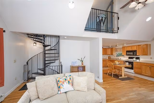 Right off the living space, there are two glass sliders that provide a refreshing breeze and lots of natural light which lead to a large deck great for taking in the views, entertaining or watching the hummingbirds! Home boasts two decent sized bedrooms, one on the 1st floor and the second through the unique spiral staircase which overlooks the living room and can be closed off for privacy.